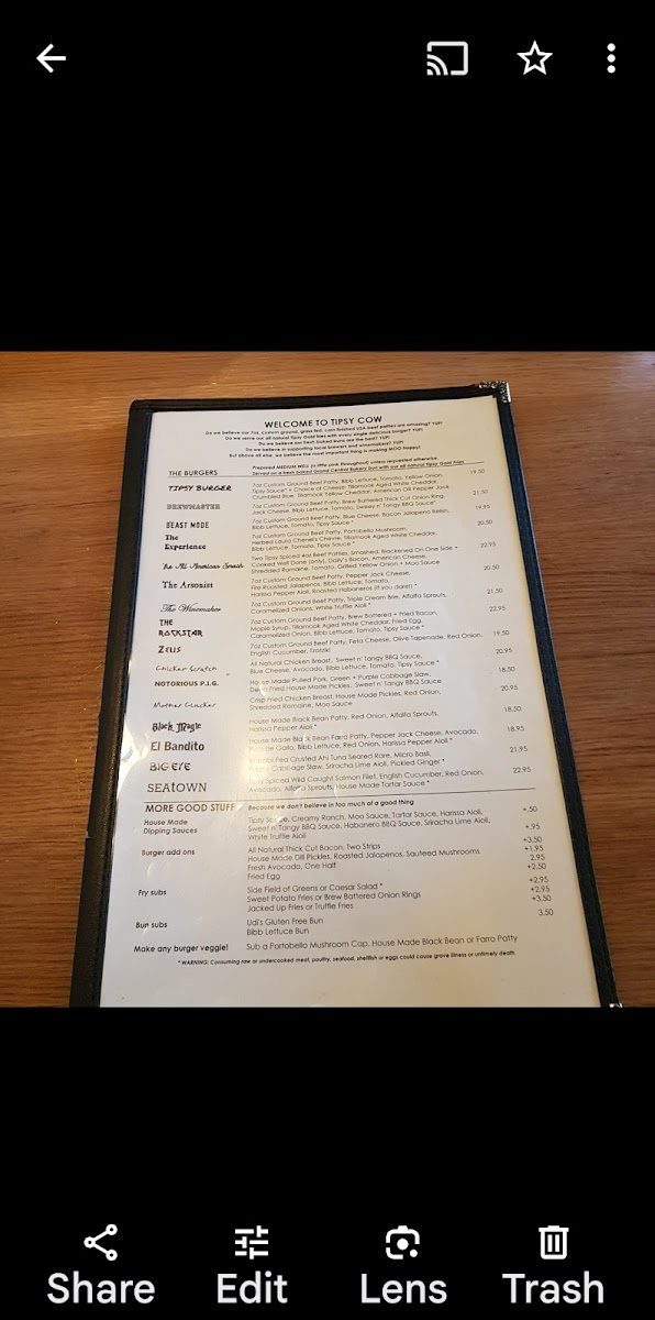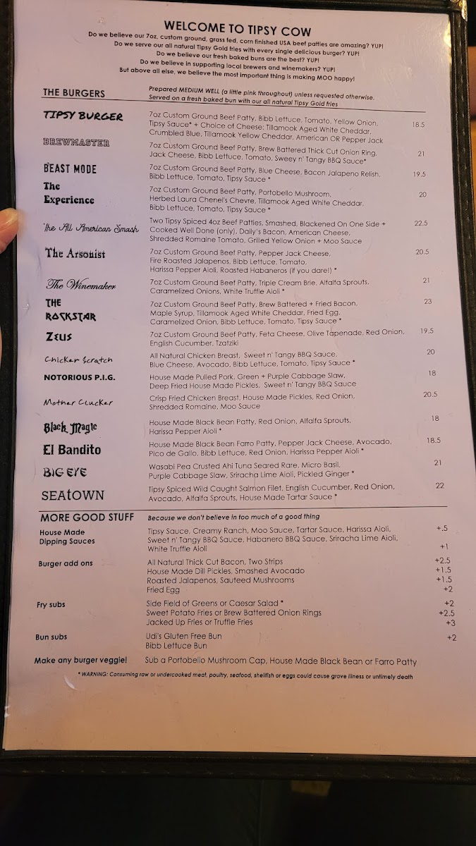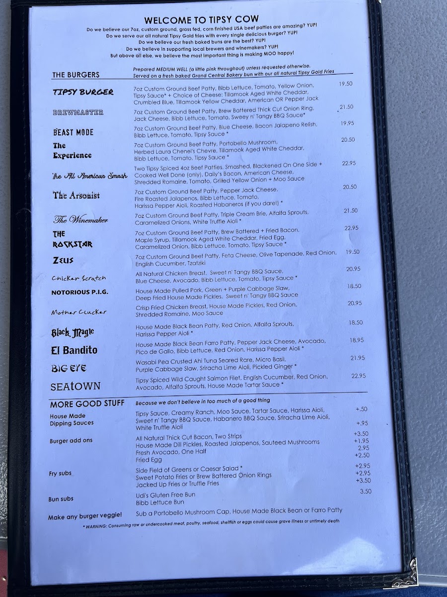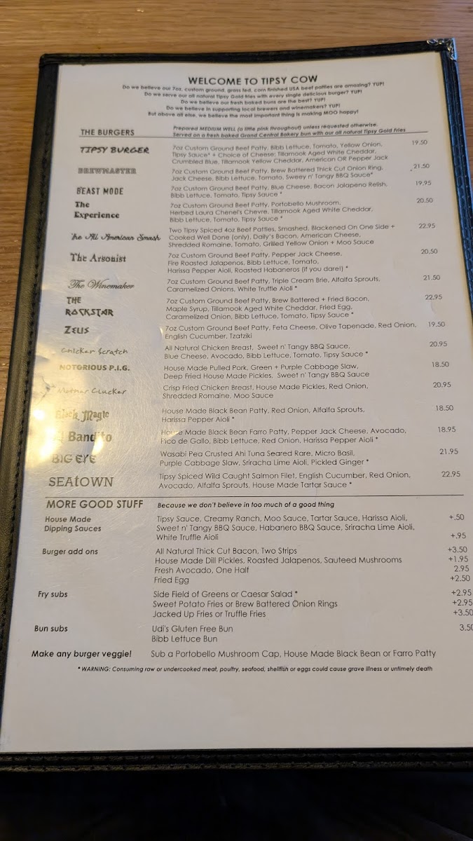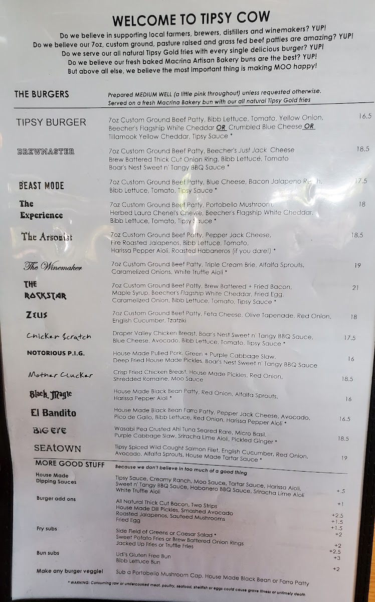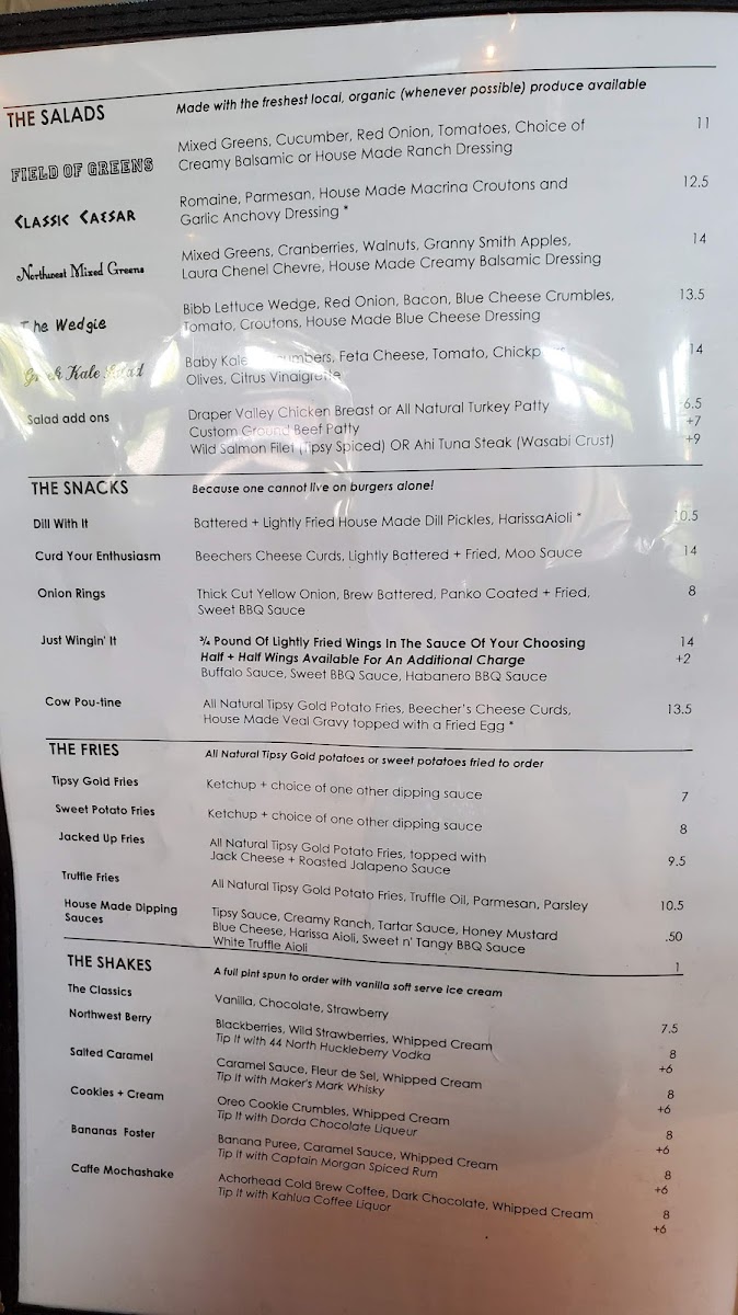 The menu at Tipsy Cow - Woodinville offers a straightforward selection of casual, comforting bites perfect for a relaxed meal or a laid-back evening out. The focus is on classic hamburger fare elevated with thoughtful twists—think juicy, flavorful burgers like the Tipsy Burger with Bacon, alongside crispy sides such as fried pickles and truffle fries. Alongside these, there are fresh salads and shareable plates like mozzarella cheese sticks and their signature Cow Pou-Tine.