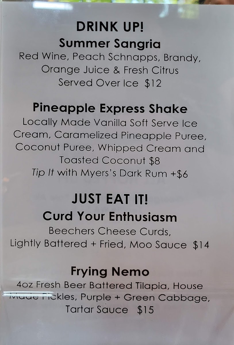 Drink options add a playful and refreshing element, featuring everything from innovative coffee-based shakes to staple sodas and craft beers like The Brewmaster and Big Eye IPA. Non-alcoholic choices—such as strawberry lemonade with a hint of balsamic and rosemary, or classic iced tea—fit seamlessly with the vibrant, friendly atmosphere.